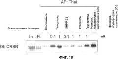 [Фиг.18] На фиг.18 показано связывание производных талидомида с CRBN. Экстракты клеток 293Т смешивали с гранулами, содержащими иммобилизованный талидомид. Связанные белки элюировали производными талидомида. Связанные белки промывали и элюировали производными талидомида. Элюированную фракцию анализировали методом вестерн-блоттинга. Термин ”наполнитель”, использованный на данной фигуре, означает ДМСО. Термин ”фракция, подвергнутая кипячению в SDS” означает фракцию, в которой связанные белки были отсоединены путем нагревания гранул при 98,5°С в буфере, содержащем 2% SDS. CRBN был элюирован талидомидом и глутаримидом и не был элюирован фталимидом и 5-гидрокси(2,6-диизопропилфенил)-1Н-изоиндол-1,3-дионом (5НРР-33).[Fig. 18] Fig. 18 shows the binding of thalidomide derivatives to CRBN. 293T cell extracts were mixed with pellets containing immobilized thalidomide. Bound proteins were eluted with thalidomide derivatives. Bound proteins were washed and eluted with thalidomide derivatives. The eluted fraction was analyzed by Western blotting. The term "filler" used in this figure means DMSO. The term "fraction subjected to boiling in SDS" means a fraction in which the bound proteins were detached by heating the granules at 98.5 ° C in a buffer containing 2% SDS. CRBN was eluted with thalidomide and glutarimide and was not eluted with phthalimide and 5-hydroxy (2,6-diisopropylphenyl) -1H-isoindole-1,3-dione (5HPP-33).