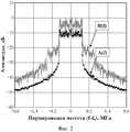 Для оценки уровня нелинейных искажений, вносимых исследуемым устройством 10, как в полосе информационного сигнала, так и вне его полосы, используют преобразование Фурье, которое позволяет представить полученные данные в частотной области (фиг. 4).To assess the level of nonlinear distortion introduced by the device under
