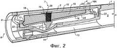 Корпус на выходном конце имеет два отверстия. Первое из них всасывающее отверстие 9, сообщающееся с камерой 10, как подробнее описано ниже, а второе выходное отверстие 11, из которого осуществляется дозированная выдача вдыхаемой композиции, что также подробнее рассмотрено ниже. Как ясно видно на Фиг.3, выходное отверстие 11 создано на отдельном компоненте 12.The housing at the output end has two holes. The first of them is a