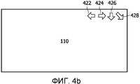 Продолжая c вышеупомянутым примером, Фиг.4b показывает увеличенный вид окна 110, показанного на Фиг.1b, с отображенными значками 422, 424, 426 и 428, обновленными для того, чтобы отразить новые возможности изменения размера окна 110. Нажатие на направленную влево горизонтальную стрелку 422 реверсирует увеличение, описанное выше, открывая окно 120, и восстанавливает окно 110 к его исходному размеру, показанному на Фиг.la. Начиная с увеличенного вида на Фиг.1b, нажатие на направленную вправо горизонтальную стрелку 424 дополнительно увеличивает окно 110 горизонтально, что приводит к компоновке окна, показанной на Фиг.1с, при которой дополнительно скрывается окно 130. Начиная с увеличенного вида, показанного на Фиг.1b, нажатие на вертикальную стрелку 426 увеличивает окно 110 вертикально, что приводит к компоновке окна, показанной на Фиг.1d, при которой дополнительно скрываются окна 140 и 150. Начиная с увеличенного вида на Фиг.1b, нажатие на диагональную стрелку 428 увеличивает окно 110 и горизонтально, и вертикально, что приводит к компоновке окна, показанной на Фиг.1e, при которой дополнительно скрываются окна 130, 140, 150 и 160.Continuing with the aforementioned example, FIG. 4b shows an enlarged view of the