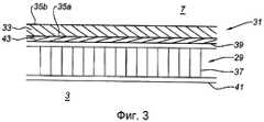 На фиг.3 показан внутренний неподвижный элемент 29, на который устанавливают средство 31 тепловой защиты, в соответствии с одним из вариантов осуществления предлагаемого изобретения. Указанное средство тепловой защиты содержит теплоизоляционную подушку 33 типа Pyrogel 6671, состоящую из аэрогелей на основе кварцевых волокон, которая помещена между слоем 35а стекловолоконного материала и листом 35b из нержавеющей стали. Теплоизоляционные подушки типа Pyrogel 6671 производятся компанией Aspen Aerogels (30 Forbes Road, Building B, Northborough, MA 01532 - USA). Что касается внутреннего неподвижного элемента 29, то она, как и рассмотренный выше внутренний неподвижный элемент 9, содержит многослойную металлическую панель 37 с ячеистой структурой, расположенную между внутренней облицовкой 39 и наружной облицовкой 41, которые могут быть выполнены из металла или композитного материала.Figure 3 shows the inner