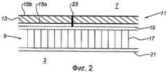 На фиг.2 проиллюстрировано средство 11 тепловой защиты, закрепленное на внутреннем неподвижном элементе 9 со стороны центрального отсека 7. В состав средства 11 тепловой защиты входит теплоизоляционная подушка 13, подобная используемым в конструкции самолета Airbus A380 в качестве средства тепловой защиты, которая помещена между двумя листами 15а и 15b из нержавеющей стали. Внутренний неподвижный элемент 9 включает в себя металлическую панель 17, представляющую собой многослойную панель с ячеистой структурой; указанная панель расположена между внутренней облицовкой 19 и наружной облицовкой 21, которые выполнены из металла или композитного материала.Figure 2 illustrates a thermal protector 11 mounted on an internal