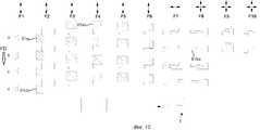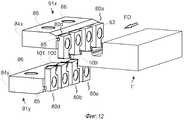 На фиг. 12 проиллюстрирован примерный вариант осуществления того, как согласно изобретению могут быть устранены производственные отклонения. Конструкция режущего инструмента 91 проиллюстрирована в качестве примера. Режущий инструмент может иметь два противолежащих рабочих местоположения инструментов, например верхний режущий инструмент 91x, а также нижний режущий инструмент 91y, которые дополнительно могут устранить отклонения, поскольку они работают, располагаясь близко друг к другу, обрабатывая горизонтальные запирающие поверхности 11,19; 12,18 на одном и том же этапе. Нижние платформы 96ay-jy, см. фиг. 11, предназначены для обеспечения ровной опоры. В данном случае для нижнего режущего инструмента 91у требуется поддержка снизу нижними платформами 96ay-jy. Форма наконечников производится в зависимости от того, какую необходимо произвести запирающую систему, а то, как зубья 80 располагаются на арматурах 84, зависит от того, как профилировать материал - сверху или снизу. Верхние платформы 96ax-jx используются для закрепления арматуры и для обработки сверху и снизу, а нижние платформы 96ay-jy используются для закрепления арматуры и для обработки снизу. Если бы фиг. 11 иллюстрировала производственную линию 90, использующую две арматуры 84x, 84y, как на фиг. 12, наконечники зубьев 80a-d показывали бы вниз, а не показывали бы вверх, как можно увидеть на фиг. 11. Наконечники зубьев на нижних арматурах 84y тогда показывали бы вверх, как показано на фиг. 12, что не показано на фиг. 11. Обработка материала снизу и сверху осуществляется подобным образом.In FIG. 12 illustrates an exemplary embodiment of how manufacturing deviations can be eliminated according to the invention. The design of the