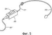 Фиг.5 представляет собой схематическое пояснение конкретного варианта осуществления электронного адаптера 500 для селективной модификации информационного аудиосигнала для обеспечения подачи аудиосигнала в наушники 560. Как показано на фиг.5, электронный 500 адаптер может быть исполнен относительно компактно и представляет собой автономное приспособление, которое имеет выходной разъем для соединения с источником сигнала и обеспечения подачи модифицированного сигнала в выходное устройство. Портативный электронный адаптер 500 в данном примере имеет стандартное соединительное гнездо для соединения с вводным кабелем 507 входного устройства (не показано на фиг.5), такого как МР3 плейер, сотовый телефон и т.п. и подключения к наушникам 560 через выводной кабель 571. Портативный электронный адаптер 500 может принимать вид любого из вариантов осуществления, проиллюстрированных на фигурах 2, 3 или 4. В данном случае портативный электронный адаптер 500 имеет компактный корпус (который может быть изготовлен из литьевого пластика или другого влагонепроницаемого материала) с вращающимся колесиком 524, при помощи которого пользователь вручную выбирает или корректирует вручную хранимый профиль модификации для применения портативным электронным адаптером 500.FIG. 5 is a schematic diagram of a specific embodiment of an