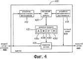 Фиг.4 представляет собой функциональную блок-схему третьего варианта осуществления электронного адаптера 400 для селективной модификации информационного аудио- или видеосигнала для использования с выходным устройством. Показанный на фиг.4 вариант осуществления аналогичен варианту осуществления, показанному на фиг.2, но дополнительно включает в себя второе устройство 418 автоматического распознавания для автоматического определения типа или марки выходного устройства (не показано на фиг.4). Второе устройство 418 автоматического распознавания может устанавливать тип или марку выходного устройства, например, путем осуществления кратковременного квитирования с выходным устройством, когда выходное устройство впервые подключается к электронному адаптеру 400. Альтернативно, второе устройство 418 автоматического распознавания может устанавливать тип или марку выходного устройства путем измерения электронных характеристик выходного устройства посредством использования тестового сигнала 419.FIG. 4 is a functional block diagram of a third embodiment of an