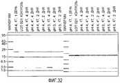 На Фигурах 31-35 показано действие pH и температуры на hCD83ext дикого типа (серия 021), как проанализировано с помощью нередуцирующего (левые дорожки) и редуцирующего (правые дорожки) SDS-PAGE.Figures 31-35 show the effect of pH and temperature on wild-type hCD83ext (021 series), as analyzed by non-reducing (left tracks) and reducing (right tracks) SDS-PAGE.