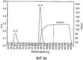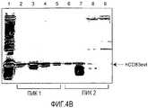 На Фигуре 4A показана характерная двухпиковая хроматограмма на стадии тонкой очистки hCD83ext с использованием анионообменной хроматографии, содержит два основных пика. На Фигуре 4B показан SDS-PAGE анализ каждой из фракций тонкой очистки. Дорожки 2-5 представляют первый пик и дорожки 6-9 представляют второй пик. Дорожка 1 представляет пост-GST образец, нагруженный на анионообменную хроматографическую колонку для тонкой очистки. Обратите внимание, что hCD83ext находится в первом пике, тогда как другие контаминирующие белки находятся во втором пике. Гель окрашивали нитратом серебра.Figure 4A shows a typical two-peak chromatogram at the stage of fine cleaning hCD83ext using anion exchange chromatography, contains two main peaks. Figure 4B shows an SDS-PAGE analysis of each of the fine fractions. Lanes 2-5 represent the first peak and Lanes 6-9 represent the second peak.
