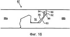 На фиг.16 показан вид сбоку части узла 87 другого варианта осуществления панелей 88а, 88b пола в соответствии с изобретением, содержащего три блокировочных механизма. Первый и второй блокировочные механизмы аналогичны первому и второму блокировочным механизмам, которые показаны на фиг.6, 14 и 15. Третий блокировочный механизм основан на применении наружного выступа 89, расположенного на наружной поверхности 90 направленного вниз шипа 91 левой панели 88а пола, который взаимодействует с дополняющей выемкой 92 направленного вверх торца 93 правой панели 88b пола. Выступ 89 выполнен с возможностью небольшой деформации относительно основной части направленного вниз шипа 91 благодаря наличию по существу вертикальной прорези 94, расположенной рядом с выступом 89, выполненной в выравнивающем крае 95 направленного вниз шипа 91. Данная гибкость облегчает заскакивание выступа 89 в выемку 92 и, таким образом, осуществление соединения между панелями 88а, 88b пола.On Fig shows a side view of part of a
