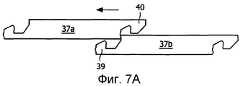 На фиг.7А-7F показаны последовательные этапы способа реализации соединения между двумя панелями 37а, 37b пола в соответствии с фиг.6. На первом (необязательном) этапе, который показан на фиг.7А, вторую соединительную деталь 40 первой панели 37а пола перемещают в направлении первой соединительной детали 39 второй панели 37b пола посредством скольжения первой панели 37а пола по второй панели 37b пола (см. стрелку). Затем, как показано на фиг.7В, вторую соединительную деталь 40 первой панели 37а пола совмещают с первой соединительной деталью 39 второй панели 37b пола посредством перемещения нижней стороны 38b внутреннего слоя 38 первой панели 37а пола вдоль верхней стороны 41d направленного вверх шипа 41 второй панели 37b пола (см. стрелку) до тех пор, пока выравнивающий край 46а направленного вниз шипа 46 первой панели 37а пола не будет опираться на выравнивающий край 41b направленного вверх шипа 41 второй панели 37а пола (фиг.7С). При этом другой выравнивающий край 46b направленного вниз шипа 46 первой панели 37 пола будет также преимущественно входить в контакт с верхней стороной 38а внутреннего слоя 38. Затем посредством оказания усилия вниз на, по меньшей мере, перемычку 50 второй соединительной детали 40 первой панели 37а пола, направленный вниз шип 46 будет поворачиваться в направлении вверх относительно направленного вниз торца 47, при этом направленный вверх шип 41 второй панели 37b пола будет также преимущественно поворачиваться относительно направленного вверх торца 42 второй панели 37b пола (фиг.7D). Во время данной временной деформации соединительных деталей 39, 40 как направленный вниз паз 48 первой панели 37а пола, так и направленный вверх паз 43 второй панели 37b пола будут подвергаться расширению, так что направленный вниз шип 46 первой панели 37а пола может быть размещен, по меньшей мере, частично в направленном вверх пазу 43 второй панели 37b пола, а направленный вверх шип 41 второй панели 37b пола может быть размещен, по меньшей мере, частично в направленном вниз пазу 48 первой панели 37а пола (фиг.7Е). После того как усилие на панели 37а, 37b пола ослабляют, деформация будет по существу закончена, и панели 37а, 37b пола будут взаимно соединены. Дополнительная фиксация осуществляется в данном случае за счет того, что блокировочные элементы 44, 49 обеих панелей 37а, 37b пола взаимодействуют друг с другом в соединенном положении. Отсоединение же панелей 37а, 37b пола может быть осуществлено посредством перемещения свободного внешнего конца, обращенного от второй панели 37b пола, первой панели 37а пола в направлении вверх, после чего панели 37а, 37b пола отцепляются друг от друга. По желанию, перемещение первой панели 37а пола в направлении вверх может быть облегчено посредством использования инструмента, например, такого как клин. Другим способом отсоединения панелей 37а, 37b пола является перемещение панелей 37а, 37b пола вдоль друг друга, в результате чего соединительные детали 39, 40 могут быть удалены друг от друга, что приводит к отсоединению панелей 37а, 37b пола.FIGS. 7A-7F show successive steps of a method for realizing a connection between two