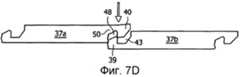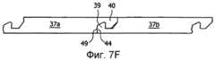 Перемычка 50, расположенная между верхней стороной 48а направленного вниз паза 48 и верхней стороной 40а, обладает некоторой упругостью и приспособлена для обеспечения поворота направленного вниз шипа 46 относительно направленного вниз торца 47, который приводит к (временному) расширению направленного вниз паза 48, тем самым облегчая соединение панели 37 пола со смежной панелью пола (см. фиг.7А-7F). Показанная панель 37 пола может представлять собой панель паркетного пола, доску, ламинированную панель пола или пластмассовую панель пола.The