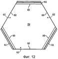 На фиг.12 показан вид сверху альтернативной панели 59 пола в соответствии с изобретением. Панель 59 пола содержит шесть равных сторон 60, причем стороны 60 попеременно содержат первую соединительную деталь 61 и вторую соединительную деталь 62. Первая соединительная деталь 61 по структуре аналогична первой соединительной детали 39, которая показана на фиг.6, а вторая соединительная деталь 62 по структуре аналогична второй соединительной детали 40, которая показана на фиг.6. Может быть изготовлен пол с сотовым рисунком посредством соединения шестиугольных панелей 59 пола посредством взаимодействия первых соединительных деталей 61 и вторых соединительных деталей 62 разных панелей 59 пола.12 is a plan view of an