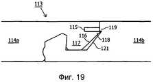 На фиг.19 показан вид сбоку части узла 113 другого варианта осуществления панелей 114а, 114b пола в соответствии с изобретением, содержащего три блокировочных механизма. Первый и второй блокировочные механизмы аналогичны первому и второму блокировочным механизмам, которые показаны на предыдущих чертежах. Третий блокировочный механизм основан на применении горизонтальной прорези 115, расположенной на наружной поверхности 116 направленного вниз шипа 117 левой панели 114а пола, причем упомянутая прорезь 115 ограничена выступающим фиксирующим краем 118, который взаимодействует с дополняющим противоположным краем 119, образующим часть направленного вверх торца 120 правой панели 114b пола.FIG. 19 is a side view of part of a