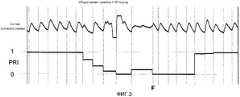 На фиг.3 показан пример иллюстративного вычисления PRI. Верхняя кривая на фиг.3 показывает исходный сигнал плетизмограммы, тогда как нижняя кривая на фиг.3 показывает PRI, вычисленный, используя уравнение (8) для N=4. Каждая вертикальная линия на фиг.3 обозначает начало импульса. Использовалось одиночное принудительное обнаружение импульса, которое обозначено меткой "F" на вертикальной линии, соответствующей принудительному обнаружению импульса. Как ожидалось, PRI имеет значение единицы (1) в областях, где сигнал плетизмограммы имеет явную визуальную регулярность, и PRI уменьшается до нулевого значения (0) в центральной области на фиг.3, где регулярность сигнала плетизмограммы имеет явную визуальную нерегулярность.Figure 3 shows an example illustrative PRI calculation. The upper curve in FIG. 3 shows the initial plethysmogram signal, while the lower curve in FIG. 3 shows the PRI calculated using equation (8) for N = 4. Each vertical line in FIG. 3 indicates the beginning of a pulse. A single forced pulse detection was used, which is indicated by a “F” mark on the vertical line corresponding to the forced pulse detection. As expected, the PRI has a value of unity (1) in areas where the plethysmogram signal has obvious visual regularity, and the PRI decreases to zero (0) in the central region of FIG. 3, where the regularity of the plethysmogram signal has obvious visual irregularity.