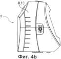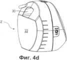 На фиг.4а-4е устройство по изобретению показано в другом примере выполнения, который отличается от примера выполнения по фиг.3 тем, что вторая часть 8 корпуса и образованный ею контейнер 10 выполнены более значительными по объему. Скос в верхней части обращенной к телу стороны 22 второй части 8 корпуса, где образована захватная выемка 30, немного круче наклонен в сторону от тела пользователя. За счет этого возможен еще лучший захват. Эта более объемная вторая часть 8 корпуса приспособлена скорее для стационарного режима работы устройства 2; для этого она может иметь выгнутую наружу выпуклую сторону 22 или быть выполнена еще толще, чем это показано на фиг.4.On figa-4e the device according to the invention is shown in another exemplary embodiment, which differs from the exemplary embodiment in figure 3 in that the