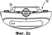 Далее, как показано на чертежах, в области плоскости 14 разъема между примыкающими друг к другу частями 4, 8 корпуса имеется проходная щель 46 для ввода и разъемного крепления средства крепления, в частности и предпочтительно в виде гибкого пояса, или скобы, или планки, на которых может быть укреплен, например, пояс, или наплечный несущий ремень, или элемент крепления другого вида. Было установлено, что предпочтительно это средство крепления может быть отсоединено от частей 4, 8 корпуса, чтобы не мешать, когда устройство 2 используется в стационарном режиме работы, то есть стоит предпочтительно на ровной опоре 16, когда подлежащий лечению пациент отдыхает на больничной койке. На фиг.2d на стороне 18 первой части 4 корпуса показано средство 48, на которое может надеваться или на котором может фиксироваться или удерживаться вставленное в проходную щель 46 средство крепления.Further, as shown in the drawings, in the region of the plane of the