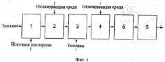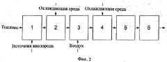 Дымовой газ вторичной каталитической горелки, который содержит водород и окись углерода, а также азот, двуокись углерода, водяной пар, и сбалансированные другие инертные газы, затем может быть охлажден подходящим устройством охлаждения на четвертой стадии перед пропусканием в абсорбер кислорода на пятой стадии, где он регенерирует сорбент абсорбера кислорода.The flue gas of the secondary catalytic burner, which contains hydrogen and carbon monoxide, as well as nitrogen, carbon dioxide, water vapor, and balanced other inert gases, can then be cooled with a suitable cooling device in the fourth stage before being passed to the oxygen absorber in the fifth stage, where it regenerates the sorbent of an oxygen absorber.