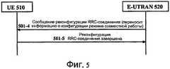 Как показано на Фиг. 5, когда пользовательское устройство 510 находится в состоянии RRC_Connected, если базовая станция 520 обнаруживает активацию сети в создающем помехи частотном диапазоне (например, ISM), и таким образом оценивает, что пользовательское устройство, возможно, нуждается в режиме совместной работы, тогда базовая станция 520 инкапсулирует информацию о конфигурации режима совместной работы в сообщение реконфигурации RRC-соединения и передает это сообщение к пользовательскому устройству (этап 501-4). Пользовательское устройство может возвращать сообщение завершения реконфигурации RRC-соединения к базовой станции (этап 501-5), подтверждая получение информации о конфигурации.As shown in FIG. 5, when the