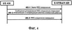 Как показано на Фиг. 4, когда пользовательское устройство (UE) 410 входит в состояние RRC_Connected из состояния RRC_idle, оно передает запрос на установление RRC-соединения к базовой станции (E_UTRAN) 420 (как показано на этапе 401-1). Базовая станция инкапсулирует информацию о конфигурации режима совместной работы в сообщение установления RRC-соединения и передает это сообщение к пользовательскому устройству (этап 401-2). Пользовательское устройство возвращает сообщение завершения RRC-соединения к базовой станции (этап 401-3), подтверждая получение информации о конфигурации.As shown in FIG. 4, when the user equipment (UE) 410 enters the RRC_Connected state from the RRC_idle state, it sends an RRC connection request to the base station (E_UTRAN) 420 (as shown in step 401-1). The base station encapsulates the collaboration mode configuration information in an RRC connection establishment message and transmits this message to the user device (step 401-2). The user device returns an RRC connection termination message to the base station (step 401-3), confirming receipt of configuration information.