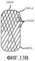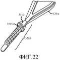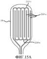 Набор ребер может содержать центральное осевое ребро, первый поднабор ребер, продолжающихся от центрального осевого ребра в первом направлении, и второй поднабор ребер, продолжающихся от центрального осевого ребра в направлении, противоположном первому направлению. Ребра первого поднабора могут быть расположены параллельно между собой. Ребра второго поднабора могут быть расположены параллельно между собой. Первый поднабор ребер и второй поднабор ребер могут продолжаться от центрального осевого ребра под таким углом, что первый и второй поднаборы ребер продолжаются от центрального осевого ребра к дистальному концу центрального осевого ребра. Первый поднабор ребер и второй поднабор ребер могут продолжаться от центрального осевого ребра под углом в диапазоне от более чем 0 градусов до 90 градусов. Первый поднабор ребер и второй поднабор ребер могут продолжаться от центрального осевого ребра под углом, приблизительно, 45 градусов. Первый поднабор ребер и второй поднабор ребер могут иметь толщину меньше толщины центрального осевого ребра. Набор ребер может содержать нитинол. Набор ребер может содержать центральное осевое ребро, набор боковых ребер, расположенных параллельно центральному осевому ребру, с равными разделяющими промежутками между ними и с каждой стороны от центрального осевого ребра, и набор соединительных ребер, расположенных поперечно боковым ребрам и соединяющих боковые ребра.The set of ribs may comprise a central axial rib, a first subset of ribs extending from the central axial rib in a first direction, and a second subset of ribs extending from the central axial rib in a direction opposite to the first direction. The edges of the first subset can be parallel to each other. The edges of the second subset can be parallel to each other. The first subset of ribs and the second subset of ribs can extend from the central axial rib at such an angle that the first and second subset of ribs extend from the central axial rib to the distal end of the central axial rib. The first subset of ribs and the second subset of ribs may extend from the central axial rib at an angle in the range of more than 0 degrees to 90 degrees. The first subset of ribs and the second subset of ribs may extend from the central axial rib at an angle of approximately 45 degrees. The first subset of ribs and the second subset of ribs may have a thickness less than the thickness of the center axial rib. The set of ribs may contain nitinol. The set of ribs may include a central axial rib, a set of side ribs parallel to the central axial rib, with equal separating gaps between them and on each side of the central axial rib, and a set of connecting ribs located transverse to the side ribs and connecting the side ribs.