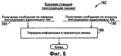 Как показано на фигуре 2, запоминающее устройство 146 также содержит программу 182 восходящей связи, выполнение которой микропроцессором 144 в рассматриваемом варианте обеспечивает прием восходящего сигнала от одного или нескольких ретрансляторов 104, 106, 108, 110 и 112 (показаны на фигуре 1). Как показано на фигуре 5, выполнение программы 182 восходящей связи начинается либо на стадии 184 после приема восходящего сигнала по первому восходящему радиоканалу 164 через радиоантенну 154 (показана на фигуре 2) или на стадии 186 после получения восходящего сигнала по второму восходящему радиоканалу 166 через радиоантенну 154. В любом случае программа 182 восходящей связи продолжается на стадии 188, выполнение которой микропроцессором 144 обеспечивает передачу сообщения, закодированного в сигнале, который был принят на стадии 184 или 186, в блок 158 транзитной связи (показан на фигуре 2). Таким образом, как это показано на фигуре 1, в рассматриваемом варианте базовая станция 102 принимает восходящие сигналы по первому 164 и 166 второму восходящим радиоканалам от ретрансляторов 104, 106, 108, 110 и 112 и передает сообщения, закодированные в этих восходящих сигналах, в блок 158 транзитной связи (показан на фигуре 2).As shown in FIG. 2, the