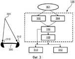 На Фиг.3 показан вариант осуществления изобретения, содержащий головные телефоны 300. Согласно этому варианту осуществления изобретения детектор 104 содержит первый микрофон 302 и второй микрофон 304. Первый микрофон 302 и второй микрофон 304 детектируют звук 301 окружающей среды. Первый микрофон 302 и второй микрофон 304 подают на вход процессора 106 сигналов детектированный звук окружающей среды. Процессор 106 сигналов идентифицирует специфические звуки в звуках окружающей среды и определяет информацию об источнике специфических звуков. Процессор 106 сигналов передает специфические звуки к контроллеру 108, а контроллер 108 изменяет рабочую характеристику управления аудио потока, проигрываемого через первый динамик 310 и второй динамик 312 набора головных телефонов 300. Например, контроллер 108 приостанавливает проигрывание аудио потока или понижает громкость аудио потока. В то же время процессор 106 сигналов предоставляет информацию об источнике специфических звуков через первый динамик 310 и второй динамик 312. Например, процессор 106 сигналов предоставляет воспроизведение специфического сигнала, который должен быть проигран через динамик 310 и второй динамик 312.FIG. 3 shows an embodiment of the invention comprising