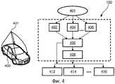 На Фиг.4 показан другой вариант осуществления изобретения, содержащего аудио систему 400 автомобиля. Согласно этому варианту осуществления изобретения детектор 104 содержит микрофоны 402, 404, 406 аудио системы автомобиля. Аудио система автомобиля может иметь несколько микрофонов. Микрофоны 402, 404, 406 детектируют звук 401 окружающей среды и каждый подают детектированный звук внешней среды в процессор 106 сигналов. Процессор 106 сигналов идентифицирует специфические звуки в звуках окружающей среды и определяет информацию об источнике специфических звуков. Процессор 106 сигналов передает специфические звуки к контроллеру 108, а контроллер 108 изменяет рабочую характеристику управления аудио потока, который проигрывается через динамики 412, 414, 416 аудио системы 400 автомобиля. Например, контроллер 108 приостанавливает проигрывание аудио потока или понижает громкость аудио потока. В то же время процессор 106 сигналов предоставляет информацию об источнике специфических звуков через динамики 412, 414, 416. Например, процессор 106 сигналов предоставляет воспроизведение специфического сигнала, который должен быть проигран, через динамики 412, 414, 416.FIG. 4 shows another embodiment of the invention comprising an