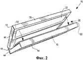 Рассмотрим более подробно картонную заготовку 28, каждая из верхней и нижней частей 30 и 32 заготовки содержит центральную, в целом плоскую часть, образующую заднюю панель или стенку 34 отделений. Створки 36 и 38 боковой стороны проходят из противоположных боковых краев или линий изгиба 40 задней панели 34. Створки 36 и 38 боковой стороны в целом являются зеркальным отображением друг друга. Каждая створка 36 и 38 боковой стороны содержит промежуточную линию сгиба 42, проходящую в целом параллельно боковой линии сгиба 40. Линии сгиба 42 и 40 ограничивают в целом прямоугольную боковую панель или стенку 44 отделений.Let us consider in more detail the