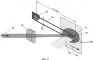 Измеренный профиль распределения интенсивности в фокальном пятне изображен на Фиг. 3, где 23 - это изображение указанного фокального пятна, полученное с помощью профилометра, 24 - реальный измеренный профиль распределения интенсивности в указанном пятне в направлении движения метки, 25 - автоматическая аппроксимация указанного профиля 24 с помощью распределения Гаусса, 26 - профиль распределения интенсивности в направлении, перпендикулярном движению.The measured focal spot intensity distribution profile is depicted in FIG. 3, where 23 is the image of the specified focal spot obtained using the profilometer, 24 is the actual measured profile of the intensity distribution in the specified spot in the direction of the mark, 25 is the automatic approximation of the specified