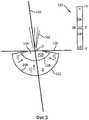 На фиг.2 поясняется работа процессора для вычисления потоков, показанного на фиг.1. В основу процессора положена математическая модель поля скоростей потока в точках дискретизации внутри зоны включения, как поясняется ниже. В варианте осуществления с 2-мерным изображением, зона включения является, предпочтительно, изогнутой полосой, оконтуренной двумя дугами с центрами на местонахождении регургитационного отверстия, {x0, y0, z0}. В варианте осуществления с 3-мерным изображением, изогнутая полоса имеет форму полусферического слоя, как поясняется ниже в связи с фигурой 3. В предпочтительном варианте осуществления, является векторной моделью скоростей поля скоростей потока видаFigure 2 explains the operation of the processor for calculating the flows shown in figure 1. The processor is based on a mathematical model of the flow velocity field at the sampling points within the inclusion zone, as explained below. In the embodiment with a 2-dimensional image, the inclusion zone is preferably a curved strip contoured by two arcs with centers at the location of the regurgitation hole, {x0 , y0 , z0 }. In the embodiment with a 3-dimensional image, the curved strip has the shape of a hemispherical layer, as explained below in connection with figure 3. In the preferred embodiment, is a vector model of the velocity field of the flow velocity of the form