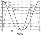 На фиг.6 показаны амплитудно-частотные характеристики двух доплеровских фильтров выделения стенок, которые можно использовать в варианте осуществления настоящего изобретения. Координаты по оси абсцисс графика на фиг.6 представлены в единицах пределов Найквиста фильтра выделения стенок из дискретизированных данных, где пределы +1 и -1 являются нормированными пределами Найквиста фильтра, соответствующего скоростям кровотока. Нулевое состояние (постоянного сигнала или в отсутствие потока) находится в центре. Координаты по оси ординат указывают относительную амплитудную характеристику характеристики фильтра. Характеристическая кривая 140 является типичной характеристической кривой фильтра выделения стенок для измерения кровотока и может быть использована в варианте осуществления настоящего изобретения. Приведенная характеристика имеет нулевой отклик в центре, что имеет следствием отсутствие отклика на неподвижные объекты, например, неподвижные стенки сосудов. Как показано, отклик монотонно возрастает по мере того, как кривая продолжается от нуля, с максимальным откликом на пределах Найквиста для потоков с максимальной скоростью, обнаруживаемых без искажений дискретизации при выбранном интервале дискретизации. В результате, приведенная амплитудно-частотная характеристика наиболее чувствительна к потоку с максимальными скоростями потока.Figure 6 shows the amplitude-frequency characteristics of two Doppler filters for selecting walls, which can be used in an embodiment of the present invention. The coordinates on the abscissa axis of the graph in Fig. 6 are presented in units of the Nyquist limits of the filter for separating walls from the sampled data, where the limits +1 and -1 are the normalized Nyquist limits of the filter corresponding to blood flow velocities. The zero state (constant signal or in the absence of flow) is in the center. The coordinates along the ordinate axis indicate the relative amplitude response of the filter characteristic. The