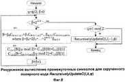 где,и обозначают подвекторы с четными и нечетными номерами компонентов, соответственно, и обозначает вероятность того, что был передан символ при условии того, что на выходе канала получен символ. Эффективный метод реализации этих вычислений был описан в [4]. Фиг.2 представляет блок-схему рекурсивной функции RecursivelyCalcP(l,λ,φ), которая вычисляет эти вероятности для l-го пути, для случая, в соответствии с [4]. Заметим, что для четных она производит рекурсивный вызов для нахождения значений, фигурирующих в правой части вышеприведенных уравнений. Непосредственные вычисления производятся в блоках, которые реализуют уравнения (1) и (2). Результаты сохраняются в переменных, где. Кроме того, декодер последовательного исключения должен хранить значения промежуточных символов, соответствующих каждому пути. Фиг.3 представляет блок-схему рекурсивной функции RecursivelyCalcC(l,λ,φ), решающей эту задачу в соответствии с [4]. Для l-го пути посредством блок-схемы находят значения, которые используются при вычислении уравнений (1) и (2). Вычисления производятся в блоке, который соответствует структуре кодера, показанной на фиг.1.Where , and denote subvectors with even and odd component numbers, respectively, and indicates the probability that a character has been transmitted provided that a symbol is received at the output of the channel . An effective method for implementing these calculations was described in [4]. Figure 2 is a block diagram of a recursive function RecursivelyCalcP (l, λ, φ), which calculates these probabilities for the l-th path for the case , in accordance with [4]. Note that for even it makes a recursive call to find the values appearing on the right side of the above equations. Direct calculations are performed in blocks that implement equations (1) and (2). Results are saved in variables. where . In addition, the sequential exception decoder must store intermediate symbol values corresponding to each path. Figure 3 is a block diagram of a recursive function RecursivelyCalcC (l, λ, φ) that solves this problem in accordance with [4]. For the l-th way through the flowchart find the values which are used in the calculation of equations (1) and (2). The calculations are made in a block that corresponds to the structure of the encoder shown in figure 1.