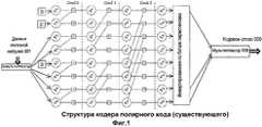 Полярные коды, предложенные в работе E. Arikan (Е. Арикан) "Channel polarization: A method for constructing capacity achieving codes for symmetric binary-input memoryless channels", опубликованной в журнале IEEE Transactions On Information Theory, том 55, номер 7, страницы 3051-3073, июль 2009 [1], представляют собой первый класс корректирующих кодов, которые достигают пропускной способности широкого класса каналов передачи информации. Полярные коды являются линейными блоковыми кодами, порождаемыми некоторой подматрицей матрицы, где - перестановочная матрица обращения битов, и обозначает m-кратное Кронекеровское произведение матрицы с собой. Таким образом, кодовое слово полярного кода равно,,, где, равны кодируемым информационным символам, а, полагаются равными 0 (замороженные символы, то есть символы, значения которых никогда не меняются). Классическим методом декодирования, полученного в результате передачи по симметричному по выходу каналу без памяти, является метод последовательного исключения (ПИ). Он состоит в последовательном нахождении наиболее вероятных апостериорных значений с использованием значений,...,,,...,. Найденное значение используется на последующих шагах алгоритма декодирования. Можно показать, что сочетание линейного преобразования, задаваемого матрицей, физического канала передачи данных и декодера ПИ (при условии правильности промежуточных решений) может быть представлено как совокупность битовых подканалов различного качества, т.е. можно считать, что каждый передается по i-му подканалу. Качество (например, пропускная способность, вероятность ошибки на бит) этих подканалов может быть проанализировано с помощью метода эволюции плотностей, состоящего в вычислении плотностей распределения логарифмических отношений правдоподобия, вычисляемых на различных этапах метода ПИ (раскрыт в работе I. Tal и A. Vardy "How to construct polar codes", опубликованной в журнале IEEE Transactions On Information Theory, том 59, номер 10, октябрь 2013 [2]) или его гауссовской аппроксимации (раскрыто в работе P. Trifonov "Efficient design and decoding of polar codes", опубликованной в журнале IEEE Transactions on Communications, том 60, номер 11, страницы 3221-3227, ноябрь 2012 [3]). Одним из возможных способов построения полярного кода длины и размерности является выбор как множества индексов наихудших битовых подканалов. Фиг.1 иллюстрирует структуру кодера полярного кода. Операция кодирования разбивается на слоев. На слое промежуточный вектор получается путем применения преобразования, задаваемого матрицей, к подвекторам. Символы на слое 0 инициализируются символами полезных данных (для незамороженных символов) или нулями (замороженные символы). Кодовое слово получается на последнем слое.Polar Codes proposed by E. Arikan, "Channel polarization: A method for constructing capacity achieving codes for symmetric binary-input memoryless channels," published in IEEE Transactions On Information Theory, Volume 55, Number 7, Pages 3051-3073, July 2009 [1], are the first class of correction codes that achieve the throughput of a wide class of information transmission channels. Polar codes are linear block codes generated by some matrix submatrix where - permutation matrix of bit reversal, and denotes the m-fold Kronecker product of the matrix with itself. So the code word of the polar code is equal to , , where , equal to the encoded information symbols, and , are assumed to be 0 (frozen characters, that is, characters whose values never change). Classic decoding method received as a result of the transfer the output-symmetric channel without memory is the sequential exclusion method (PI). It consists in sequentially finding the most probable posterior values using values , ..., , , ..., . Found value used in subsequent steps of the decoding algorithm. It can be shown that the combination of the linear transformation given by the matrix , a physical data channel and a PI decoder (provided that the intermediate solutions are correct) can be represented as a combination bit subchannels 