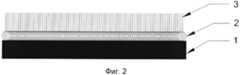 Фотография рабочей поверхности холодного катода (со стороны слоя нанотрубок), состоящего из пористой металлической подложки, слоя сажи и слоя углеродных нанотрубок, представлена на фиг. 1. На фиг. 2 схематично представлено поперечное сечение холодного катода, где 1 - пористая металлическая подложка; 2 - слой сажи; 3 - слой углеродных нанотрубок. Вольт-амперная характеристика такого холодного катода в сверхтекучем гелии представлена на фиг. 3, кривая 1. Для сравнения на фиг. 3, кривая 2, представлена вольт-амперная характеристика катода-прототипа. Из представленных графиков видно, что эксплуатационные характеристики изделий практически совпадают: напряжения начала эмиссии электронов имеют близкие значения, а максимальные токи эмиссии одинаковы.A photograph of the working surface of the cold cathode (from the side of the nanotube layer), consisting of a porous metal substrate, a carbon black layer, and a carbon nanotube layer, is shown in FIG. 1. In FIG. 2 schematically shows a cross section of a cold cathode, where 1 is a porous metal substrate; 2 - a layer of soot; 3 - a layer of carbon nanotubes. The current – voltage characteristic of such a cold cathode in superfluid helium is shown in FIG. 3,curve 1. For comparison, in FIG. 3,curve 2, presents the current-voltage characteristic of the cathode prototype. From the graphs presented, it can be seen that the operational characteristics of the products practically coincide: the voltages of the onset of electron emission are close, and the maximum emission currents are the same.