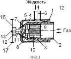 Распыливающий агент, например воздух или газ, подается по патрубку 2 через дроссельные отверстия 10 обоймы 9 в кольцевое дроссельное отверстие с внешним диаметром dc, образованное срезом сопла 4 и резонаторным стержнем 11, и затем встречает на своем пути резонаторный диск 12 с глухими резонирующими отверстиями 14. В результате прохождения генератора звуковых колебаний ультразвукового частотного диапазона распыливающим агентом (например воздухом или газом) в последнем возникают пульсации давления, создающие акустические колебания, частота которых зависит от параметров резонатора. Акустические колебания распыливающего агента способствуют более тонкому распыливанию жидкости, подаваемой через патрубок 6 в полость 8, образованную кожухом 5 с дроссельными отверстиями 7 в торце кожуха 5, и затем дробится под воздействием акустических колебаний воздуха на мелкие капли, в результате чего образуется факел распыленного раствора с воздухом, корневой угол которого определяется величиной угла наклона конической поверхности сопла 4.A spraying agent, such as air or gas, is supplied through the
