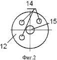 В резонаторном диске 12 расположены по крайней мере три глухих (несквозных) отверстия 14, являющихся частью генератора звуковых колебаний ультразвукового частотного диапазона, выполненного в виде конического сопла 4, соосного с корпусом 1, и имеющего кольцевое дроссельное отверстие с внешним диаметром dc, образованное срезом сопла и резонаторным стержнем 11 диаметром dcт.At least three blind (non-through)