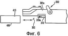 [0023] На фиг.6 показано поперечное сечение второго варианта предложенного хирургического наконечника 300. Этот наконечник 300 аналогичен наконечнику 10, за исключением того, что он оснащен вставкой 400, выполненной с возможностью съемного крепления к дистальному концу 301а. Наконечник 300 может дополнительно иметь (или не иметь) канавку 11c с вставкой 30, присутствующими в наконечнике 10. Наконечник 300 может иметь в своем составе фиксатор 310 c лапкой 310a, которая входит в зацепление с отверстием 410 вставки 400 и действует в качестве защелки, обеспечивающей крепление вставки 400 к наконечнику 300. Вставка 400, подобно заглушке 60 наконечника 10, закрывает внутреннюю часть наконечника 300, т.е. отверстие 302 и компоненты внутри отверстия 302, такие как приводной вал и аспирационный канал (не показаны). Вставку 400 прикрепляют к наконечнику 300 перед его использованием. После использования наконечника вставку 400 снимают, чтобы обеспечить возможность чистки и стерилизации указанной внутренней части и расположенных в ней компонентов. После чистки и стерилизации вставку 400 также можно почистить и прикрепить обратно к наконечнику 300. Кроме того, вставку 400 можно удалить и вместо нее прикрепить к наконечнику 300 новую.[0023] FIG. 6 shows a cross section of a second embodiment of the proposed