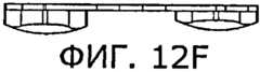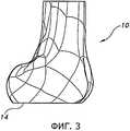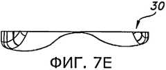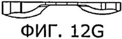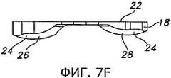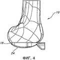 На фиг.4-8 показан пробный дистальный бедренный компонент 18 и ввод пробного дистального бедренного компонента 18 между резецированной поверхностью 14 дистального отдела 10 бедренной кости и нерезецированной поверхностью проксимального отдела 12 большеберцовой кости (например, нерезецированной поверхностью 20 проксимального отдела 12 большеберцовой кости, которая показана на фиг.2). Как показано на фиг.4-8, пробный дистальный бедренный компонент 18 имеет верхнюю плоскую поверхность 22 и нижние криволинейные поверхности 24. Верхняя плоская поверхность 22 предназначена для контакта с резецированной поверхностью 14 дистального отдела 10 бедренной кости. Нижняя криволинейная поверхность 24, которая состоит из поверхности 26 медиального мыщелка и поверхности 28 латерального мыщелка, предназначена для контакта и по меньшей мере в некоторой степени сочленения с нерезецированной поверхностью 20 проксимального отдела 12 большеберцовой кости. Верхняя плоская поверхность 22 может быть плоской, ровной или рельефной для лучшего сцепления с костью, образующей и окружающей резецированную поверхность 14 дистального отдела 10 бедренной кости. Как показано на фиг.7a-7f, пробный дистальный бедренный компонент 18, показанный на фиг.4-8, практически имитирует, по меньшей мере, некоторые из форм и толщин, образуемых бедренным имплантатом 16, в частности, по меньшей мере, некоторые из нижних участков 30 (видны на фиг.7с и 7е) этого бедренного имплантата.Figures 4-8 show a test distal