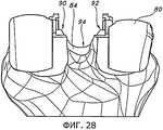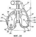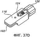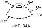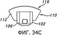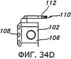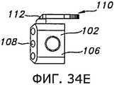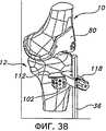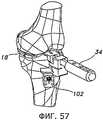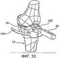 Фиг.32 и 33 иллюстрируют другое устройство, которое могут применить с пробным дистальным бедренным компонентом 18 (как показано на фиг.32) или другим пробным бедренным компонентом 80 (как показано на фиг.33) для индикации глубины резекции большеберцовой кости. На фиг.32 показан выравнивающий блок 102, соединенный с пробным дистальным бедренным компонентом 18 при помощи соответствующей рукоятки 34. Выравнивающий блок 102 могут применить для нанесения разметки на проксимальном отделе 12 большеберцовой кости, или в некоторых вариантах его могут прикрепить при помощи штифтов прямо к проксимальному отделу 12 большеберцовой кости. Поскольку соединение между пробным дистальным бедренным компонентом 18 и выравнивающим блоком 102 позволяет позиционировать выравнивающий блок 102 в определенном угловом положении относительно дистального бедренного пробного компонента 18, положение дистального бедренного пробного компонента 18 и соединенной с ним рукоятки 34 (и по меньше мере в некоторой мере степень сгибания или разгибания коленного сустава) будет влиять на позиционирование и ориентацию выравнивающего блока 102 относительно проксимального отдела 12 большеберцовой кости, в частности позиционирование в направлении вверх/вниз, варусный/вальгусный угол и наклон кзади. Однако перемещение коленного сустава вследствие сгибания и разгибания может, по меньшей мере частично, влиять на некоторые из этих положений и ориентации выравнивающего блока 102 относительно проксимального отдела 12 большеберцовой кости. Соответственно, в некоторых вариантах осуществления может оказаться целесообразным, кроме того, использовать экстрамедуллярный выравнивающий стержень 36 (показанный на фиг.8) или индикатор 104 (показанный на фиг.32), чтобы подтвердить правильное и/или требуемое позиционирование выравнивающего блока 102 на проксимальном отделе 12 большеберцовой кости.Figs. 32 and 33 illustrate another device that can be used with a test distal femoral component 18 (as shown in Fig. 32) or another test femoral component 80 (as shown in Fig. 33) to indicate the depth of the tibia resection. Fig. 32 shows a