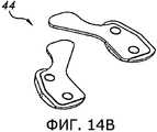 На фиг.12 и 13 показаны наборы модульных пробных дистальных бедренных компонентов, в которых для изменения конкретных форм пробного дистального бедренного компонента 18 применяют опорные пластины 44 и прокладки 46. Например, в варианте осуществления, показанном на фиг.12а-12h, применение прокладок 46 облегчит изменение толщины частей дистального бедренного пробного компонента, соответствующих внутреннему и наружному мыщелку. В ряде случаев применения набора модульных пробных компонентов дистального отдела бедренной кости, показанных на фиг.12, помогает учесть хрящевые и костные дефекты на суставной поверхности большеберцовой и/или бедренной кости, а также иные аномалии или отклонения (либо специфичную для пациента морфологию бедренных мыщелков) при оценке дистальной бедренной резекции. Фиг.13a-13i иллюстрируют набор модульных пробных дистальных бедренных компонентов, в котором модульные опорные пластины 44 могут применять для изменения общей толщины дистального бедренного пробного компонента, также или альтернативно их могут использовать для изменения определенных угловых соотношений для пробных дистальных бедренных компонентов, например, варусного/вальгусного угла или углов сгибания/разгибания дистального бедренного пробного компонента. На фиг.14а-14d показан еще один пример набора пробных дистальных бедренных компонентов, в котором модульной может быть сама опорная пластина 44, что позволяет независимо от другой части изменять медиальные и латеральные части опорной пластины. В некоторых вариантах осуществления опорные пластины 44, изображенные на фиг.14а-14d, для различных целей, например, для применения в артропластике коленного сустава с одним мыщелком могут применять по отдельности (например, могут использовать только медиальную или только латеральную часть).12 and 13 show sets of modular test distal femoral components in which