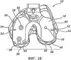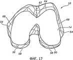 Показанный на фиг.15-20 пробный дистальный бедренный компонент 18 содержит различные ориентиры, которые показывают положение дистального бедренного пробного компонента 18 относительно дистального отдела 10 бедренной кости и резецированной поверхности 14 дистального отдела 10 бедренной кости. Например, задние края 48 нижней криволинейной поверхности пробного дистального бедренного компонента 18 могут использовать для привязки задних краев 50 резецированной поверхности 14 дистального отдела 10 бедренной кости (как показано на фиг.17). Пластины 56 могут проходить по существу перпендикулярно от задних частей дистального бедренного пробного компонента 18 до контрольных задних частей медиального и латерального мыщелка 58 дистального отдела 10 бедренной кости. Отверстия 52, имеющиеся в пробном дистальном бедренном компоненте 18, могут применить для привязки внутреннего и наружного надмыщелков 54 дистального отдела 10 бедренной кости. Еще одно отверстие или отверстия 60 могут использовать для индикации положения дистального бедренного пробного компонента 18 относительно переднезадней оси 62 дистального отдела 10 бедренной кости и/или точки 64 переднецентрального V-образного участка резецированной поверхности 14 дистального отдела 10 бедренной кости. Кроме того, могут использовать другие ориентиры, например, метки на дистальном бедренном пробном компоненте - либо сами по себе, либо в сочетании с отверстиями, пластинами и другими вышеописанными ориентирами. В некоторых вариантах осуществления передние поверхности или края дистального бедренного пробного компонента 18 могут использовать для привязки передних краев резецированной поверхности 14 дистального отдела бедренной кости.15-20, the test distal