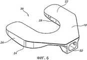 Кроме того, показанный пробный дистальный бедренный компонент 18 имеет участок 32 крепления (показанный на фиг.6), предназначенный для крепления различных инструментов и других устройств. Например, как показано на фиг.8, к крепежному участку 32 могут присоединить рукоятку 34, которую в свою очередь могут использовать для присоединения других инструментов, например, экстрамедуллярного выравнивающего стержня 36. Как показано на фиг.6, участок 32 крепления может иметь такую форму (например, некруглую форму, хотя это не является единственно возможным вариантом), которая позволяет закреплять в определенном угловом положении (например, без возможности вращения) такие предметы, как, например, рукоятка 34. В отношении крепежного участка 32 могут также использовать другие устройства, обеспечивающие возможность крепления к нему предметов в определенном угловом положении. Так, например, благодаря крепежному участку 32 можно облегчить крепление эталонного элемента, применяемого при некоторых процедурах компьютеризированной хирургии коленного сустава. Примеры других инструментов и других устройств, которые могут присоединить к крепежному участку 32, рассматриваются ниже.In addition, the test distal