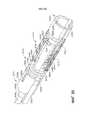 На ФИГ. 55 представлен частичный вид в поперечном сечении в перспективе одноразового загрузочного блока, манжеты и ствола, изображенных на ФИГ. 38, на котором показан одноразовый загрузочный блок, входящий в ствол, и дополнительно показана манжета во втором положении, повернутом относительно ствола.In FIG. 55 is a partial cross-sectional perspective view of a disposable loading unit, cuff, and barrel shown in FIG. 38, which shows a disposable loading unit included in the barrel, and further shows a cuff in a second position that is rotated relative to the barrel.