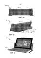 [0018] Как описано ранее, вспомогательное устройство 104 является физически и коммуникативно соединенным с главным вычислительным устройством 102 в данном примере посредством интерфейса 106 в форме гибкого шарнира. Гибкий шарнир 106 представляет собой лишь один иллюстративный пример интерфейса 106, который является пригодным, чтобы соединять и/или присоединять вспомогательное устройство к главному вычислительному устройству 102. Гибкий шарнир, например, может быть сформирован, используя один или более слоев покрытия, и включать в себя проводники, сформированные в качестве гибких дорожек, чтобы коммуникативно связывать вспомогательное устройство 104 с главным вычислительным устройством 102 и наоборот. Гибкий шарнир является гибким в том, что вращательное перемещение, обеспечиваемое шарниром, достигается посредством изгиба (например, сгибания) материала, формирующего шарнир, в противоположность механическому вращению, которое обеспечивается осью, несмотря на то, что этот вариант осуществления также предусматривается. Посредством такого вращательного перемещения гибкий шарнир позволяет вспомогательному устройству принимать многообразие положений относительно главного вычислительного устройства 102, включая, но не ограничиваясь, закрытое положение, при котором вспомогательное оборудование может выступать в роли крышки, открытое положение или положение для печати, и/или планшетное положение, при котором вспомогательное оборудование повернуто таким образом, чтобы прилегать плоскостью к «задней» стороне главного вычислительного устройства 102 (например, стороне, которая является противоположной иллюстрируемой «передней» стороне с устройством 110 отображения).[0018] As described previously, the