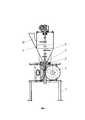 Привод устройства выполнен в виде конической зубчатой передачи. На ведущей оси 7 по обе стороны от валка 2 закреплены два ведущих конических зубчатых колеса 11, каждое из которых контактирует с ведомым коническим зубчатым колесом 12, смонтированным на оси 8, 9 близлежащего валка. Привод вращения валков осуществляется электродвигателем 13.The drive of the device is made in the form of a bevel gear. Two leading