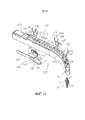 Как лучше всего показано на ФИГ.10 и ФИГ.11, нижняя бранша (220) в настоящем примере определяет канал (226), который выполнен с возможностью приема кассеты (218) со скобами. Кассету (218) со скобами можно ввести в канал (226), концевой эффектор (212) может быть приведен в действие, а затем кассету (218) со скобами можно извлечь и заменить на другую кассету (218) со скобами. Таким образом нижняя бранша (220) удерживает кассету (218) со скобами с возможностью последующего отсоединения в совмещении с упором (224) для приведения в действие концевого эффектора (212). В некоторых альтернативных вариантах изобретения компоненты кассеты (218) со скобами полностью интегрированы в нижнюю браншу (220), в результате чего концевой эффектор (212) можно использовать только один раз. Другие приемлемые формы этой нижней бранши (220) будут очевидны специалистам в данной области техники в свете идей, представленных в настоящем документе. As best shown in FIG. 10 and FIG. 11, the lower jaw (220) in the present example defines a channel (226) that is configured to receive a staple cartridge (218). The staple cassette (218) can be inserted into the channel (226), the end effector (212) can be activated, and then the staple cassette (218) can be removed and replaced with another staple cassette (218). Thus, the lower jaw (220) holds the cassette (218) with staples with the possibility of subsequent detachment in alignment with the stop (224) to actuate the end effector (212). In some alternative embodiments of the invention, the components of the staple cassette (218) are fully integrated into the lower jaw (220) so that the end effector (212) can only be used once. Other suitable shapes for this lower jaw (220) will be apparent to those skilled in the art in light of the teachings presented herein.