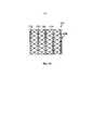 Как, например, показано на фиг. 1D и 1Е, наполнитель 102 содержит множество стабилизирующих элементов 108 (показаны пунктиром), которые допускают сжатие наполнителя в определенных направлениях, а также препятствуют ему в других направлениях. Согласно этому варианту осуществления стабилизирующие элементы 108 содержат множество стабилизирующих ребер, изогнутых деталей или стержней, выполненных из подходящего жесткого или полужесткого материала, такого как пластмасса. Ребристая структура сконфигурирована для сжатия предпочтительно вдоль определенной оси таким образом, чтобы способствовать правильному закрытию раны. Внутренние стабилизирующие элементы 108 согласно этому варианту осуществления образуют решетчатую структуру, как видно на фиг. 1D, однако следует понимать, что могут быть применены другие конфигурации. Например, расстояние между элементами в «открытом» состоянии может находиться в пределах 1-2 см. Стабилизирующие элементы 108 могут быть установлены на разных глубинах в наполнителе, как показано на виде в разрезе, представленном на фиг. 1Е, что помогает препятствовать сжатию в направлении z. Согласно некоторым вариантам осуществления стабилизирующие по оси z элементы 110 могут быть применены для препятствования сжатию в этом направлении. На фиг. 1Е стабилизирующие по оси z элементы 110 представляют собой выступы, проходящие в вертикальном направлении от ребер 108. Согласно другим вариантам осуществления могут быть применены отдельные стабилизаторы по оси z, такие как структуры в виде стержней или ребер.As shown in FIG. 1D and 1E, the