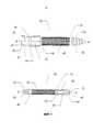 Первый конец (46) первой расширяемой сетки (48) соединен с первым цилиндрическим корпусом (32). Первая расширяемая сетка (48) выходит из первого цилиндрического корпуса (32) во втором направлении. Со вторым концом (52) первой расширяемой сетки (48) соединен первый жесткий кончик (50). Выбранные предпочтительные варианты осуществления первого жесткого кончика (50) снабжены резьбой (54), способной соединяться с хирургическим инструментом (не показан).The first end (46) of the first expandable mesh (48) is connected to the first cylindrical body (32). The first expandable mesh (48) exits the first cylindrical body (32) in a second direction. A first rigid tip (50) is connected to the second end (52) of the first expandable mesh (48). Selected preferred embodiments of the first rigid tip (50) are provided with threads (54) capable of being coupled to a surgical instrument (not shown).