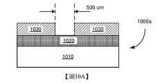 圖10A展示橫截面示意圖具有銀墨電極之超音波發射器/收發器。超音波發射器/收發器1000a包括可具有複數個感測器電路之感測器基板1010、耦接至感測器基板1010之壓電層1020及耦接至壓電層1020之厚銀墨電極1030。厚銀墨電極1030分成多個電極區段。形成厚銀墨電極1030可導致鄰近區段之間的大間隙距離,諸如大於約200 μm、大於約300 μm或介於約300 μm與約600 μm之間(例如,500 μm)的間隙距離。在一些實施方案中,厚銀墨電極1030之厚度可介於約10 μm與約50 μm之間。當沈積銀墨時,可將銀墨網版印刷兩層或多於兩層。當添加更多銀墨層時,對準誤差之容限在網版印刷中變得愈來愈大,藉此導致厚銀墨電極1030之電極區段之間的較大間隙/空間。Figure 10A shows a schematic cross-sectional view of an ultrasonic transmitter/transceiver with silver ink electrodes. The ultrasonic transmitter/