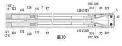 而如CN103576775A、CN106205385A及US9250733B三件專利案所示,則是分別以雙軸式轉軸或是近似雙軸式的結構使兩個機體形成相對開闔;且這三件專利案的「支撐結構」都是將其中一端部透過「實體軸」形成樞接而另一端部活動,在整個「折疊式裝置」閉合時,兩機體中的各個支撐結構均會受到另一施力件,例如:彈簧、拉簧、吸鐵、扭簧之帶動,在內部讓出一個容置空間,供容納撓性顯示器之彎曲狀中間部位,並在整個折疊式裝置展平時,以各個支撐結構分別支撐撓性顯示器之展平狀中間部位。再如中華人民共和國發明公布第CN106255935A號「折疊式設備」專利案及第CN103034293B號「顯示系統」專利案二件專利案,則是分別以一或二第一連桿成第一連桿,以推動被「實體軸」樞接的「支撐結構」產生位移,使達到縮減間距以容納「撓性顯示器彎曲部位」之效果。此種「可補償摺疊路徑之機構」的設計概念同樣也顯示在US9791892B及US10001810B二案之中,其中,US9791892B一案可視為CN106255935A之圖16a~16c的延伸案,而US10001810B案則是在其一機體(圖2的220和圖9的920)中設有「可補償摺疊路徑之機構」,包括平移板(圖2的225和圖9的921部位)、第一連桿件(圖2的330和圖9的920)或齒輪組件(圖10a的340)搭配引導件(圖9的331和圖10a的341),以達到補償折疊路徑差的效果。As shown in the three patents of CN103576775A, CN106205385A and US9250733B, the two bodies are opened and closed with a dual-shaft shaft or a similar biaxial structure respectively; and the "support structure" of these three patents One end is pivoted through the "physical shaft" while the other end is movable. When the entire "foldable device" is closed, each supporting structure in the two bodies will be subjected to another force, such as springs, Driven by the tension spring, the suction iron, and the torsion spring, an accommodating space is left inside for accommodating the curved middle part of the flexible display, and when the entire foldable device is unfolded,Each supporting structure is used to separately support the flattened middle part of the flexible display. Another example is the publication of the People’s Republic of China Inventions No. CN106255935A "Folding Device" Patent Case and No. CN103034293B "Display System" Patent Case. They use one or two first links to form the first link respectively. Push the "support structure" pivoted by the "physical shaft" to produce displacement, so as to achieve the effect of reducing the distance to accommodate the "flexible display bending part". The design concept of this "mechanism capable of compensating folding paths" is also shown in the two cases of US9791892B and US10001810B. Among them, the case of US9791892B can be regarded as an extension of Figure 16a~16c of CN106255935A, and the case of US10001810B is one of them. The body (220 in Figure 2 and 920 in Figure 9) is equipped with a "mechanism that can compensate for the folding path", including a translation plate (225 in Figure 2 and 921 in Figure 9), a first link member (330 in Figure 2 It is matched with the guide (331 in FIG. 9 and 341 in FIG. 10a) with the gear assembly (340 in FIG. 10a) to achieve the effect of compensating for the difference in the folding path.