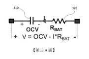 請參閱第三A圖以及第三B圖,其分別例示說明了一具體實施例中,電能提供裝置的電路等效圖以及電能提供裝置的電量曲線示意圖。如第三A圖所示實施例,由於電能提供裝置的內阻320會消耗掉部分電壓,因此電能提供裝置的可使用電壓310將如下式: OCV = V – I * RBAT其中,OCV(open circuit voltage)為電能提供裝置的可使用電壓,V為電能提供裝置的最大電壓,RBAT為電能提供裝置的等效內阻,I為流經電能提供裝置的電流。應了解,電能提供裝置的最大電壓與可使用電壓均會隨著時間或使用次數等因素而逐漸下降。第三B圖中的最大電壓曲線330即繪示了電能提供裝置的最大電壓隨使用次數的增加而減少,可使用電壓曲線340則繪示了電能提供裝置隨使用次數的增加而減少。其中,最大電壓曲線330與可使用電壓曲線340之間的差距即為電能提供裝置的內阻所消耗掉的部分電壓。在第三B圖所示實施例中,當電能提供裝置的內阻達到內阻閾值(即第三B圖中的EDV線350處)時,電能提供裝置的最大電壓與可使用電壓將急速下滑。Please refer to the third diagram A and the third diagram B, which respectively illustrate the circuit equivalent diagram of the power supply device and the schematic diagram of the power curve of the power supply device in a specific embodiment. As shown in the embodiment shown in Figure 3A, since the